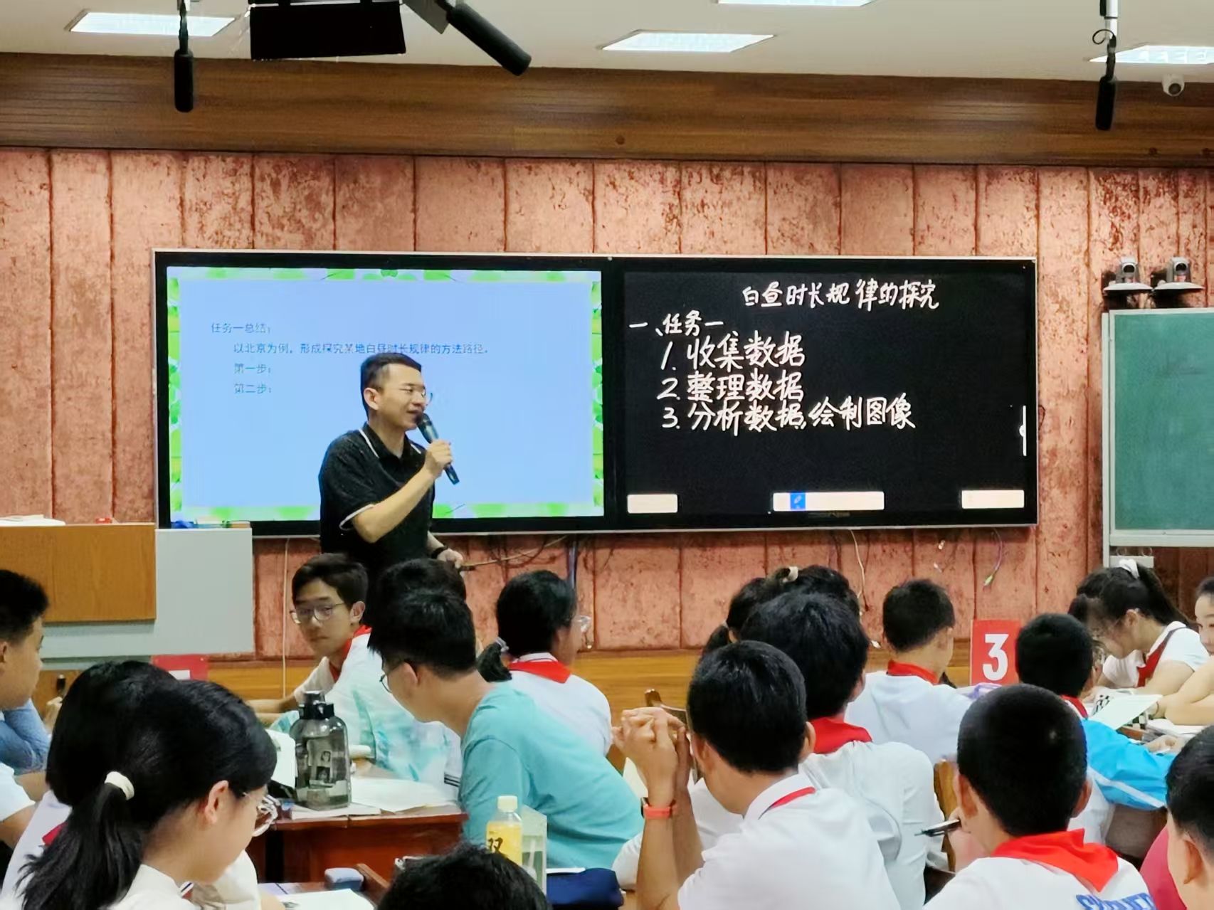 杜逸凡老师执教时对该主题课堂进行重构,将数学与地理学科和传统文化相结合,以“个人自学—小组互学—全班共学”的探究方式展开,强调数学知识的应用性和实践性。授课以天安门广场升降旗的情境导入,激发学生思考。通过两个课堂活动,递进式引导学生自行整理、描述并分析数据,探究北京以及不同地区白昼时长规律。