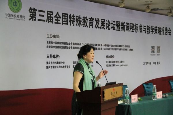 2015年6月6日—7日,第三届全国特殊教育发展论坛暨新课程标准与教学策略报告会在重庆召开。开幕式由重庆市教育评估院院长龚春燕主持,由西南大学教育学部特殊教育系主任赵斌、论坛组委会负责人、总课题组副组长袁国忠致辞,会上对“中国特色学校创建与发展战略研究”子课题实验单位授牌。开幕式结束后,紧接专题报告。
