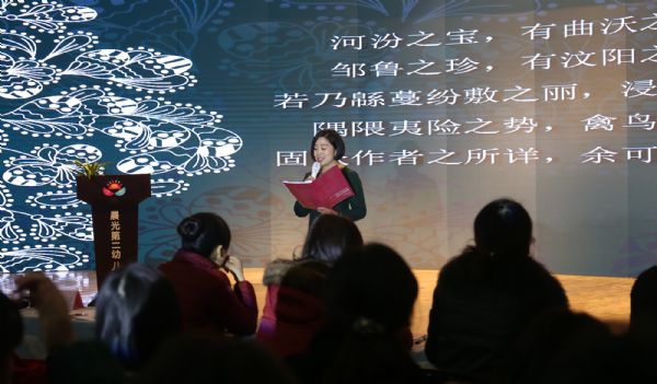 在经验交流环节,武汉市汉阳区晨光第二幼儿园的园长陈敏作了题为《幼儿园主题浸润式教研制度的实践研究》的分享活动。本次现场分享活动打破了以前单纯的报告式的交流方式,而是以湖北省公安县民间歌曲“浑身都是花”的民间艺术活动为契机,由渗透了幼儿园五大教育领域的幼儿民间艺术展示活动开场,以“有趣的印染”教师主题活动展示为问题引发的切入点,穿插“如何体现幼儿园民间艺术主题活动与幼儿整体性发展相互渗透”的教师教研活动。整场经验分享活动将开展的“一首音乐一座城”幼儿园主题浸润式园本教研制度建设的实践过程表现得淋漓尽致:有主题活动课的现场展示,有教师个人的活动反思,有教师团队的同伴互助,有园长全程的主动引导,也有区级教研员的专业点评,浸润式的教研特点由始至终贯穿其中。在浸润式的情境活动中,幼儿得到发展,在浸润式的教研活动中,教师获得专业成长。整个展示分享活动让大家真切地感受到了润物细无声的“浸润式”教研制度的独特魅力。
