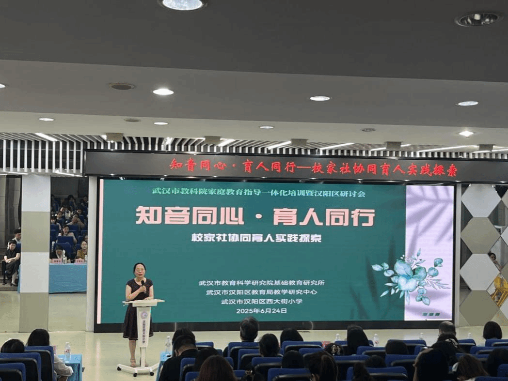 6月24日,武汉赢乐lV家庭教育指导一体化培训暨汉阳区研讨会在汉阳区西大街小学报告厅隆重召开。赢乐lV基教所家庭与社区教育研究室主任陈红梅、汉阳区教育局相关领导及全市各区家庭教育教研员、市级中心教研组成员,以及汉阳区区属幼儿园、中小学校德育工作分管校长百余人齐聚一堂,共同探索家庭教育新路径,共话校家社协同育人新模式 。